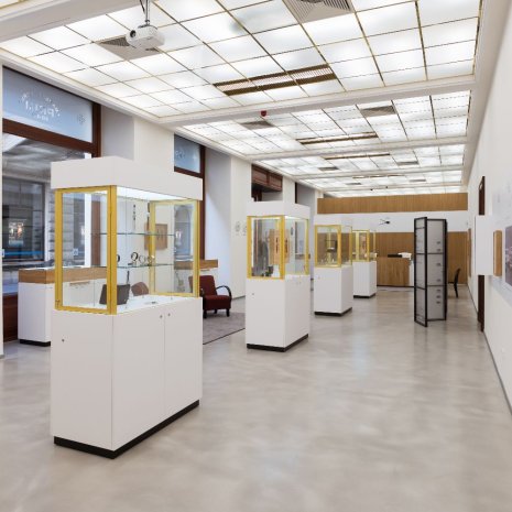 Výrobky tradiční české značky jsou originálním způsobem prezentovány na podsvícených dubových kazetách, umístěných v pultových i ve volně stojících vitrínách. Veškeré nábytkové prvky jsou řešeny převážně v kombinaci bílé barvy a dubového dřeva. Doplňující je barva mosazná a barva černá.