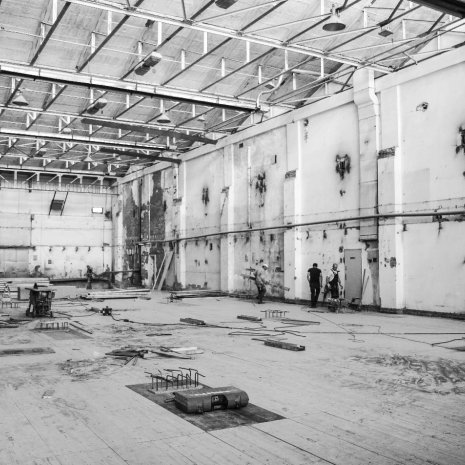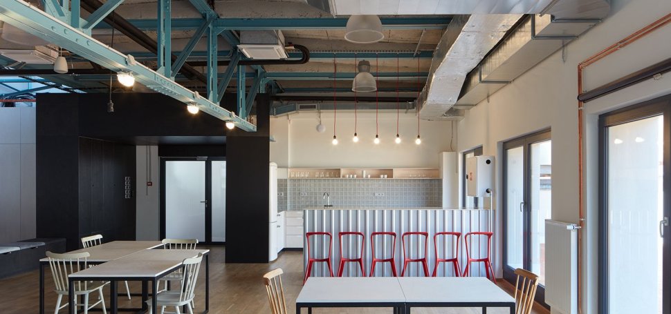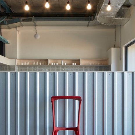 Dvířka a poličky jsou vyrobeny z bíle mořené překližky, pracovní desky z bílého umělého kamene a obklad baru z trapézového plechu.