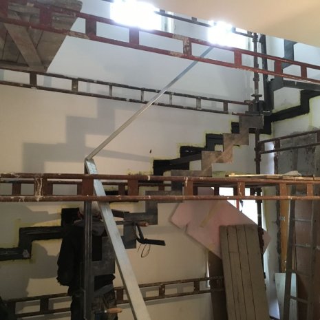 Welded steel construction of stairs and railings. Many of the locksmith work and painting had to be done on site.
